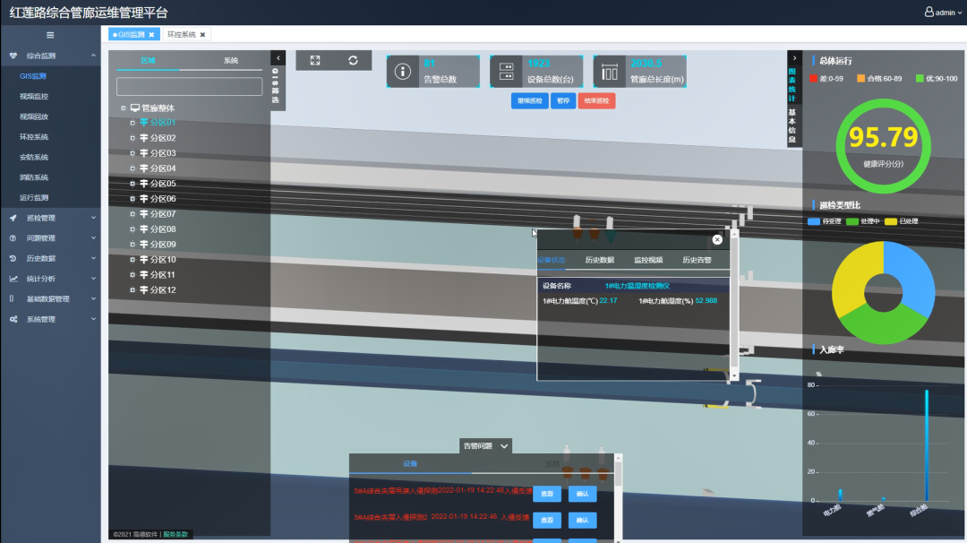 用户在管控中心即可实时了解设备运行状况及出入管廊信息等,既减少了人力成本又降低了人为操作难度及风险。